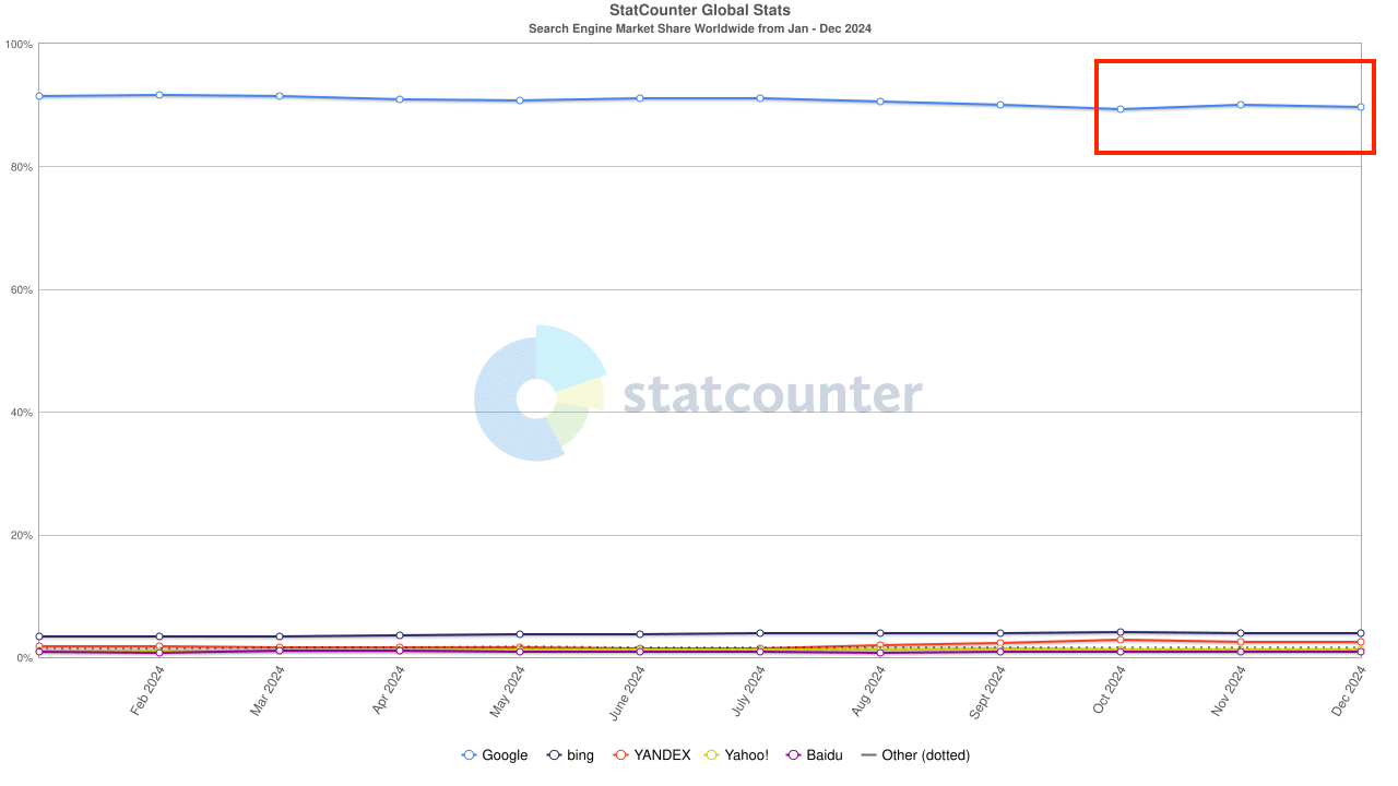 In 2000, Google surpassed Yahoo! to become the world’s largest search engine — only two short years after it first launched in 1998. Since then, Google remained dominant by adding new products and services that created an entire digital ecosystem for individual users and businesses. In early 2024, Google reached record usage with over 6.3 million searches per minute (equivalent to 8.5 billion searches per day around the world). According to Statcounter, things took a surprising turn in Q4 of 2024 when Google’s global search market share dropped below 90% for the first time since 2015.